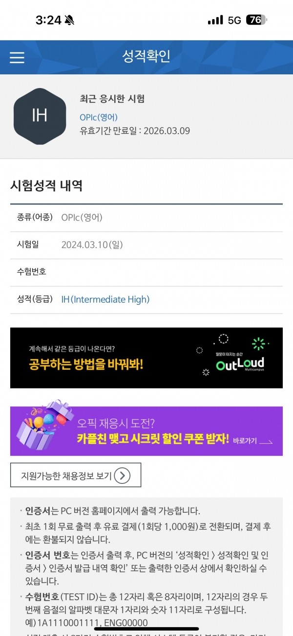 Opic IH, TSC 3등급을 취득하였으나, 이후 유효기간이 만료되어 무등급 상태였습니다.