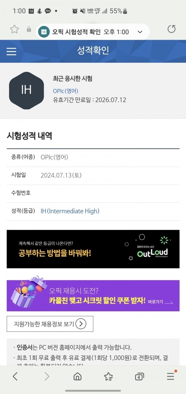 이직을 위해 영어 시험 점수 취득이 필요했고,