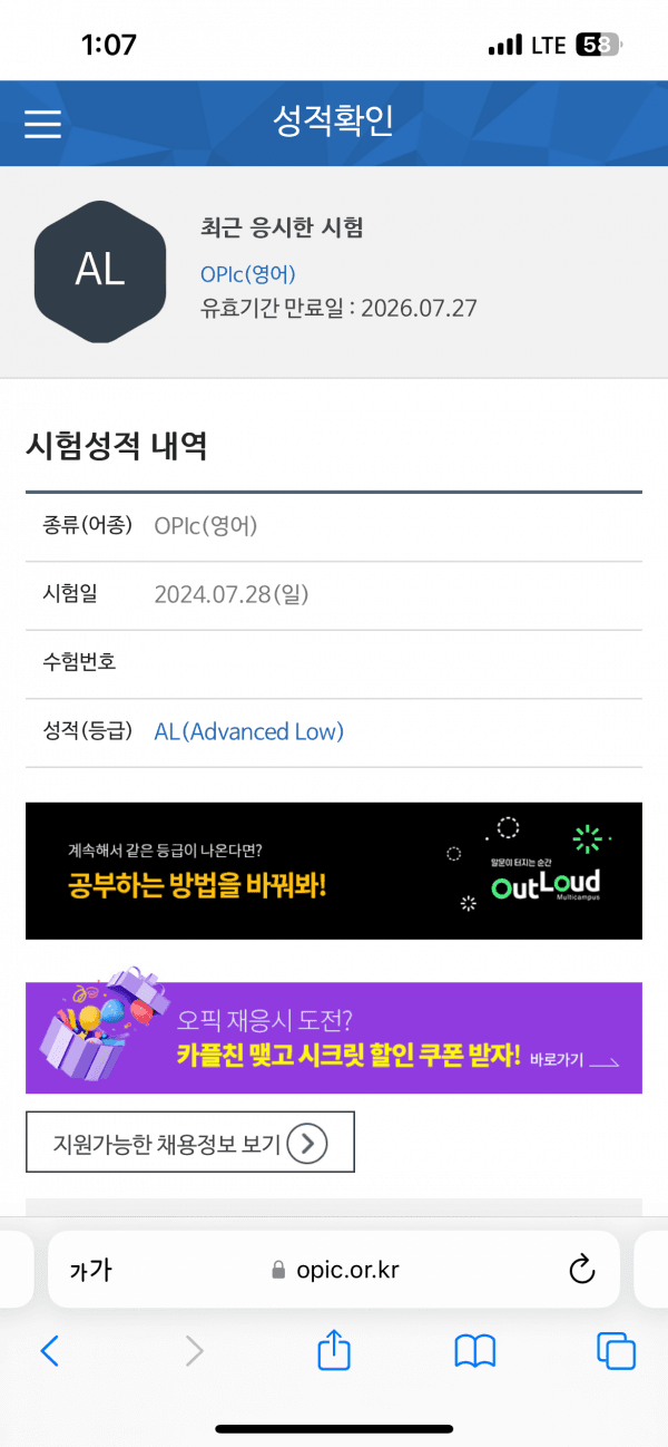 18시간 수업을 하며 많은 스크립트를 짜둔 덕에 두세문제를 제외하곤 수월하게 답했습니다. 다만 과거경험문제가 너무많이나와 두세문제는 육하원칙으로 어떻게든 엮어서 대답했습니다. 제대로 답하지 못했다고 생각해서 좋은 점수를 기대하진 않았는데 AL이 나와 너무 놀랬어요!! 612 커리큘럼대로 잘 따라해서 좋은 점수가 나온 것 같아 기쁩니다. ^^ 영어 노베이스인 사람이 한번에 AL 취득할 수 있도록 잘 지도해주신 stella 쌤께도 감사드려요~