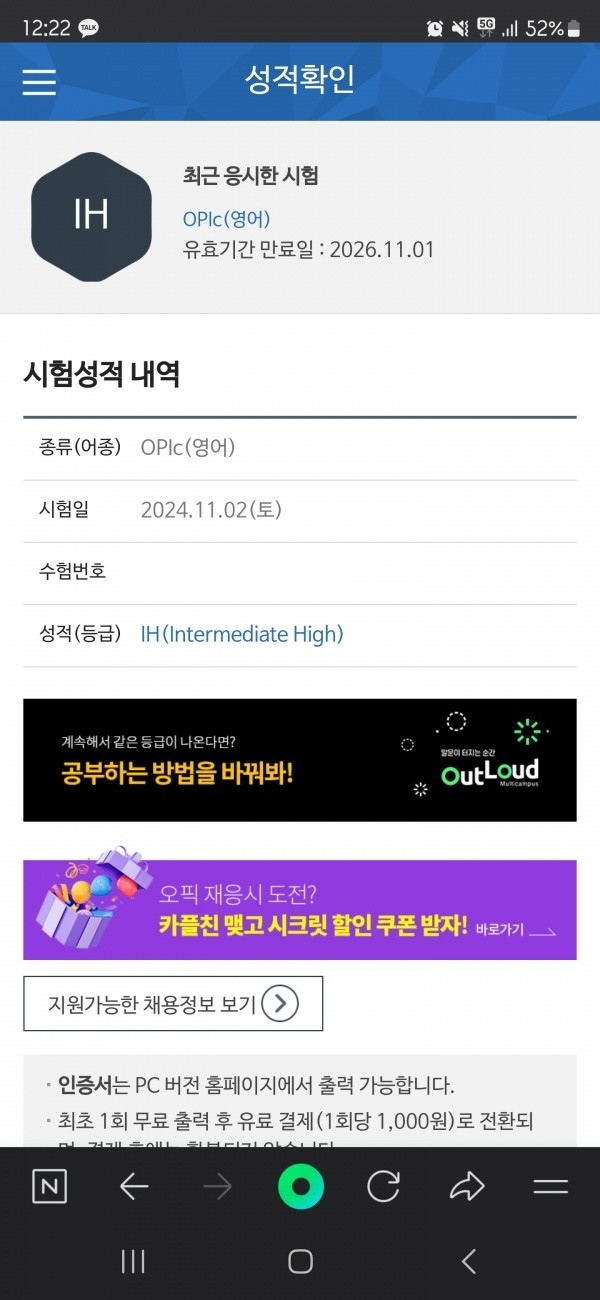 이번엔 한방에 IH가 나왔어요. 이제 오픽 졸업을 목표로 AL 도전해보려고 합니다~